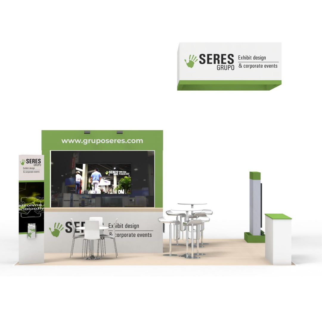 - Estructura principal fabricada en MDF revestido y pintado para la pantalla principal y la marquesina. Dos muebles centrales tipo gabinete con espacio de almacenamiento con cerradura. Tira de luces LED perimetral en la estructura principal.